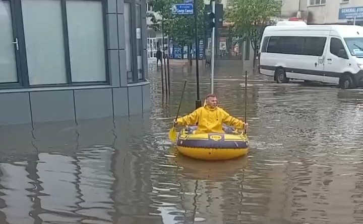 Emanuel Pană, un bârlădean crescut pe valuri încă din 1980, a îndrăznit să se plimbe cu barca pneumatică pe râul de pe Bulevardul Primăverii – un fluviu temporar oferit gratuit de natură și întreținut exemplar de autoritățile locale, care nu reușesc de 50 de ani să găsească un canal sau o scurgere care să nu joace alba-neagra cu ploaia.