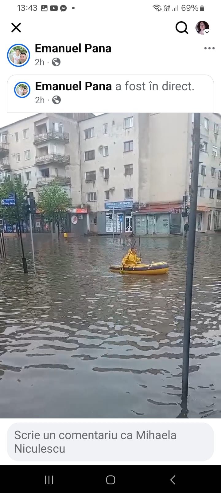 Numai că… ghinion! Plimbarea a fost întreruptă de bravii polițiști locali, care, după ce s-au autosesizat (probabil de pe Facebook, că pe teren mai greu), l-au somat pe cetățean să-și strângă barca și să înceteze „rușinea națională”. Adică, pe românește: „Nu inundația face orașul de râs. Tu îl faci, că ești ironic.”