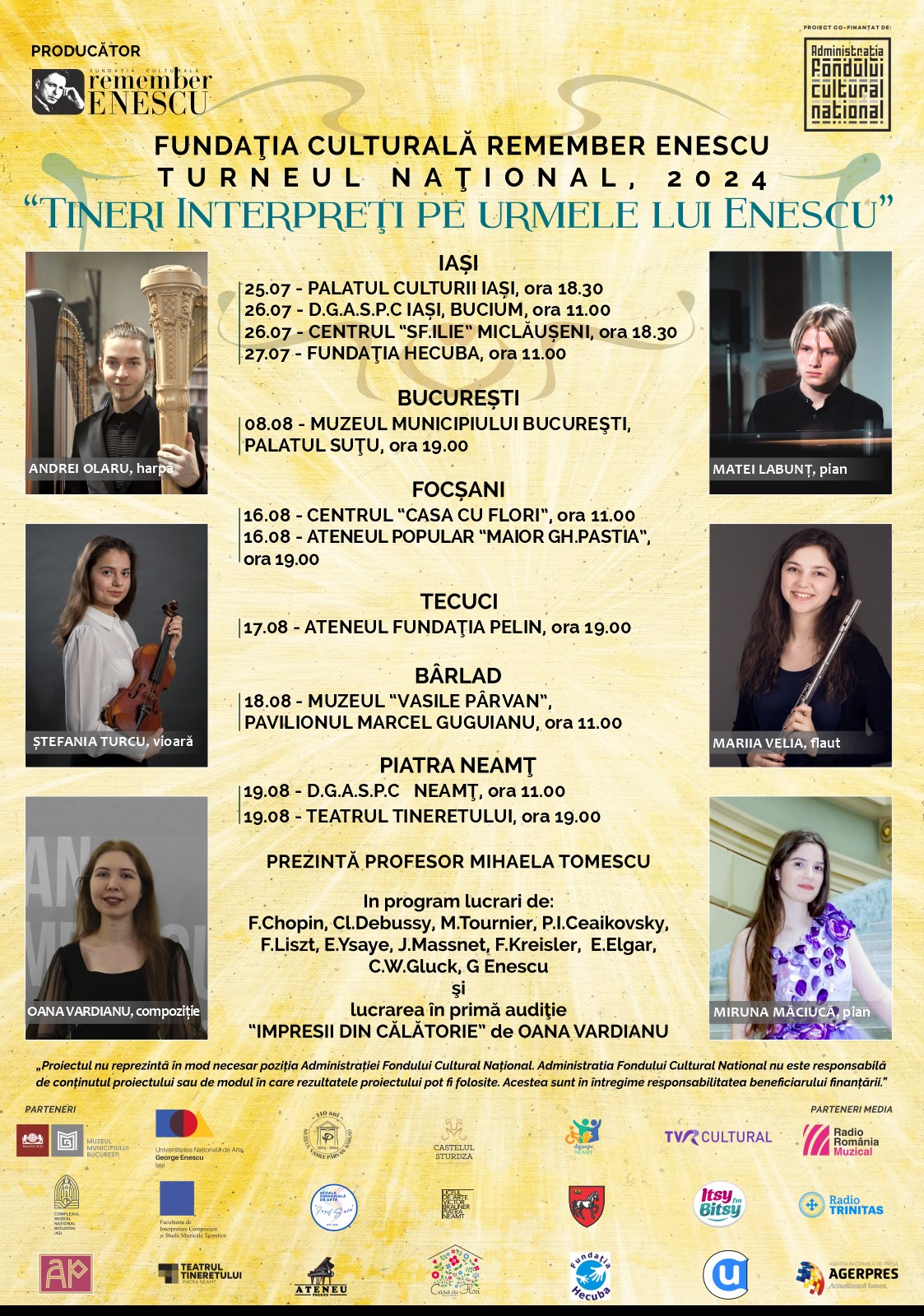 Cuprinzând 10 recitaluri de excepție, 10 prelegeri captivante despre Enescu și seminarii dedicate harpei, turneul va străbate centre culturale: București, Focșani, Bârlad, Iași și Piatra Neamț, dar și localități mai mici, Tecuci și Miclăușeni.