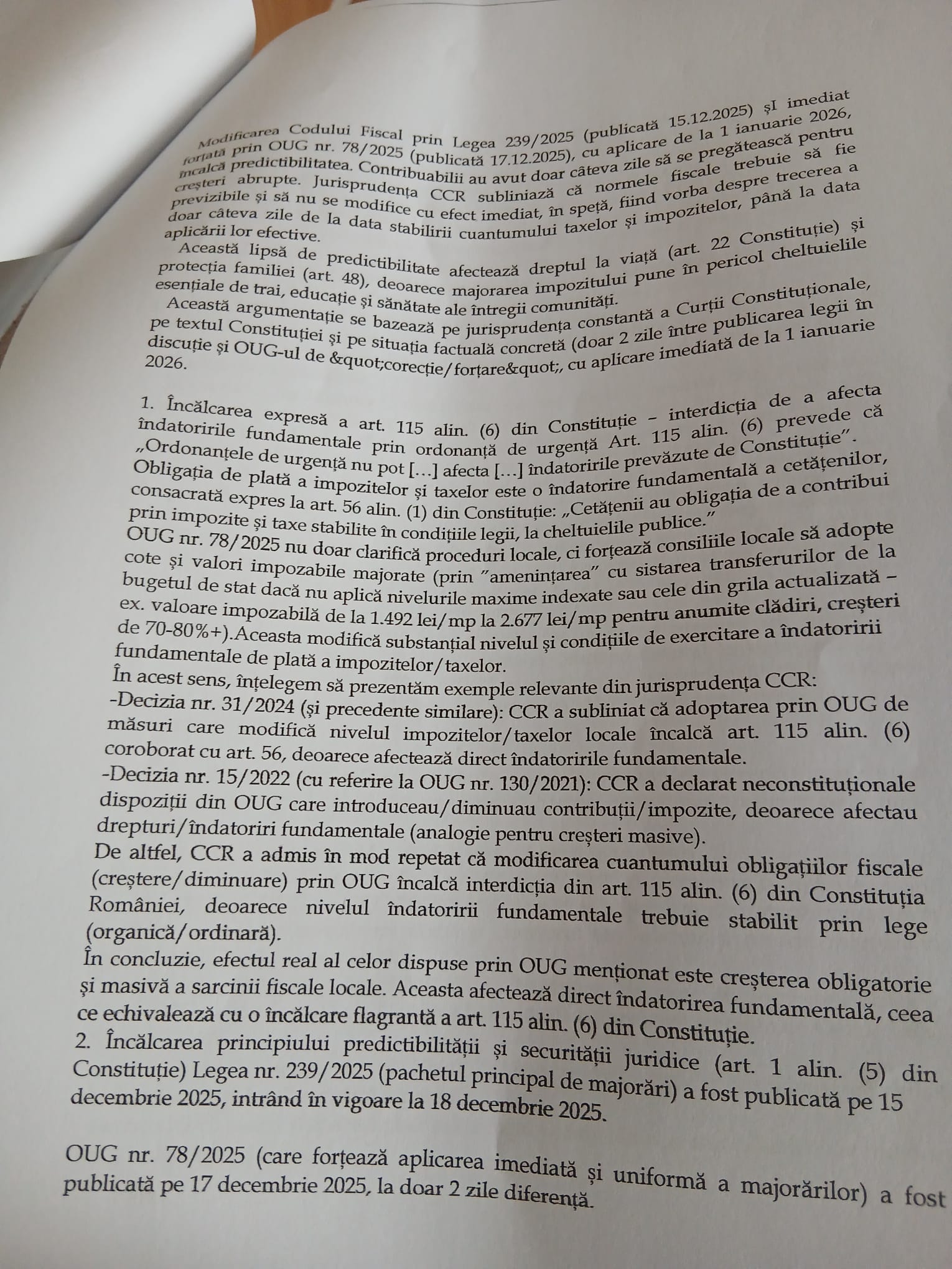 Ieri, consiliera AUR a depus la registratura Primăriei o plângere prealabilă prin care solicită revocarea, în totalitate sau în parte, a HCL nr. 654 din 22 decembrie 2025 privind stabilirea taxelor și impozitelor locale.