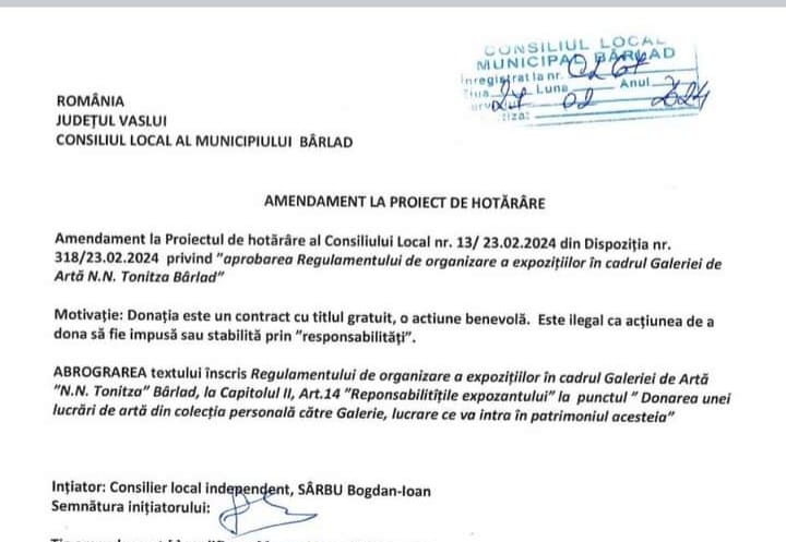 A fost votat amendamentul inițiatorului și nu cel al consilierului Bogdan Sârbu, deși acesta îl depusese înaintea celui depus de inițiator. Oricum, forma în care inițiatorul a propus amendamentul nu e una corectă, pentru că induce ideea că ar fi bine ca expozantul să doneze un tablou.