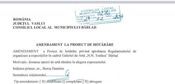 Pentru a nu părea că îl plagiază pe consilierul independent, inițiatorul proiectului, primarul Dumitru Boroș, a propus și el după două zile un amendament care prevede ca donarea operei de artă să rămână la alegerea expozantului.