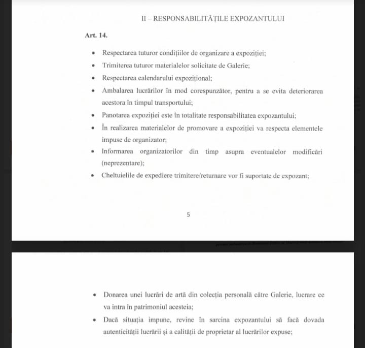 Trecând peste faptul că Regulamentul e plin de greșeli de ortografie, impardonabil pentru Direcția de Cultură, acesta cuprinde și o serie de elemente discutabile. Astfel, la Capitolul X – Obligațiile expozantului, regulamentul prevedea donarea unei lucrări de artă din colecția personală către Galerie, pentru a fi introdusă în patrimoniul acesteia.