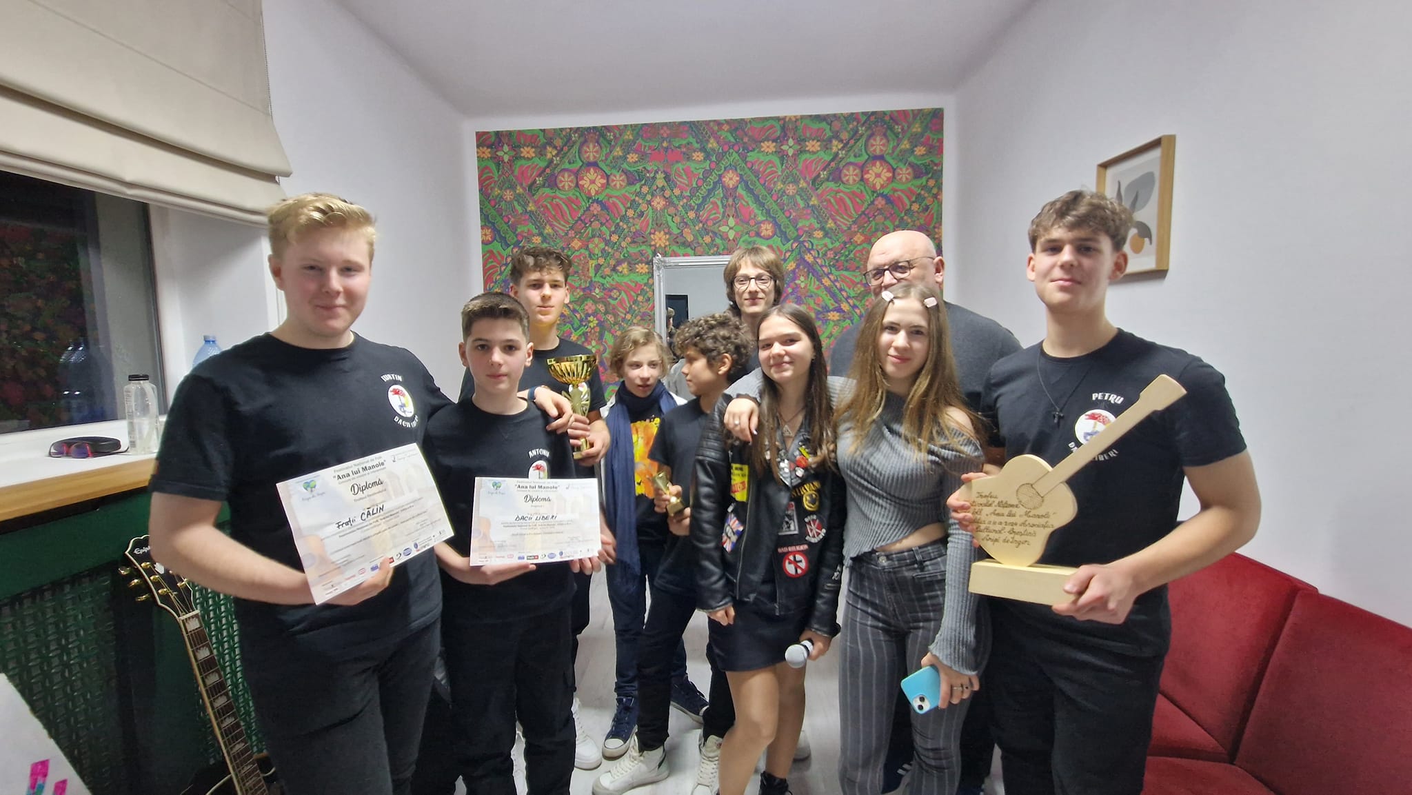 „Aseară, la Festivalul Național de Muzica folk de la Curtea de Argeș, „Ana lu’ Manole”, FRATII CĂLIN și GRUPUL DACII LIBERI, au reprezentat cu cinste Bârladul, obținând următoarele premii: Frații Călin ( Nicolae și Petru, frați gemeni) TROFEUL FESTIVALULUI – si Grupul Dacii Liberi- locul I. Au fost momente minunate, tinerii noștri primind felicitări, încurajări , dar mai ales ropote de aplauze pentru prestația avută! Premiile le-au fost înmânate de două mari personalități ale muzicii folk-rock, pentru grupul „Dacii Liberi”- locul I, premiul a fost oferit de marele chitarist al formației Phoenix, Cristi Gram – membru al juriului, iar Marele Trofeu, Fraților Călin, cu multe felicitări, a fost oferit de marele cantautor de muzica folk, președintele juriului, Emeric Imre! Tot acest mare eveniment, aflat la a III-a ediție, a fost organizat de Asociația „ARIPI DE ÎNGER”, împreună cu Centrul de Cultură și Artă „George Topîrceanu”, Primăria Curtea de Argeș și „o mână” de oameni inimoși, coordonați de doamna Mădălina Fotache, președinte al Asociației, o doamnă cu inimă mare și un suflet bun, aceasta reușind să coaguleze în jurul său oameni și firme care iubesc copiii, iubesc muzica folk! Nu mai spun că, festivalul a avut doi prezentatori de marcă, pe tânăra și talentata interpretă de muzica folk, Maria Rainea, susținută de neobositul creator de poezie, prietenul nostru, cel care ne promovează peste tot în țară, de câte ori are ocazia, marele (și la propriu și la figurat) poet, Sorin Poclitaru! Mulțumim doamnei și domnului Rainea, neobosiți promotori ai muzicii folk în zona Pitești, pentru implicare și susținere! Mulțumim părinților acestor minunați ambasadori ai Bârladului, pentru implicarea necondiționată! Mulțumesc, ca întotdeauna, în ultimii ani, domnului consilier Vasile Ivan, pentru că este permanent alături de noi, devenind o rotiță de bază în întreg angrenajul echipei! Nu în ultimul rând felicit acești copii minunați, care își sacrifică ore și zile întregi pentru repetiții, care deși sunt în clasa a VIII-a și au în față un examen dificil, au înțeles că performanțele lor în muzica folk sunt de notorietate și trebuie îmbinate cele două aspecte mai sus menționate, astfel încât să obținem note cât mai bune la examenul de capacitate, dar să continuăm și aceasta performanță notabilă în muzica folk. Ei, acești minunați copii, au reușit un lucru excepțional, au așezat Bârladul pe harta muzicii folk, alături de alte mari orașe! Dacă vom reuși să organizăm și la Bârlad un asemenea eveniment, putem spune că în sfârșit am reușit o mare performanță!”, a transmis, la încheierea festivalului, prof. Corneliu Pleșu, coordonatorul grupului folk Dacii Liberi.