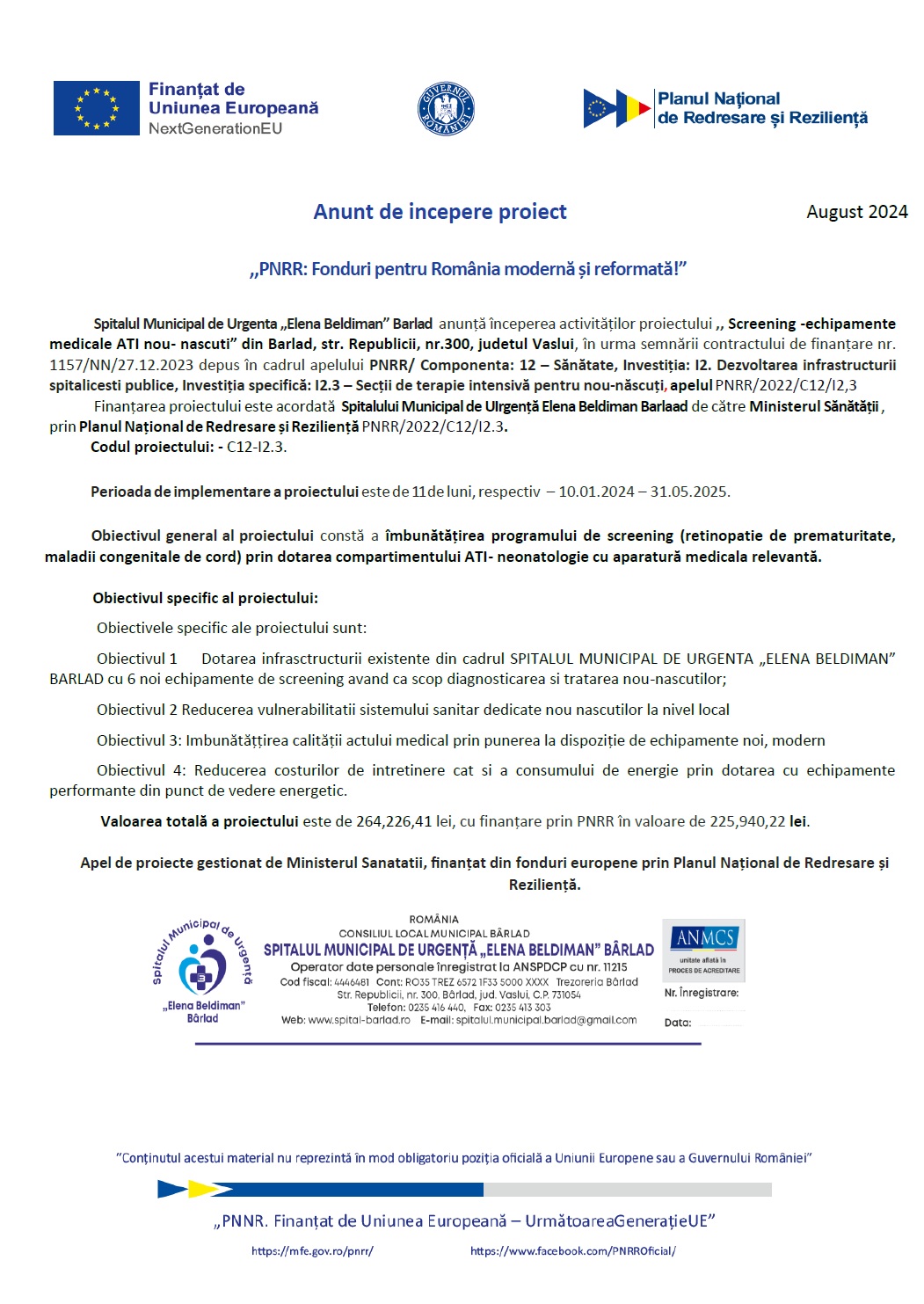Proiectul, intitulat „Screening – echipamente medicale ATI nou-născuți”, beneficiază de finanțare europeană prin Planul Național de Redresare și Reziliență (PNRR), Componenta 12 – Sănătate, în cadrul apelului PNRR/2022/C12/I2.3 – Secții de terapie intensivă pentru nou-născuți.