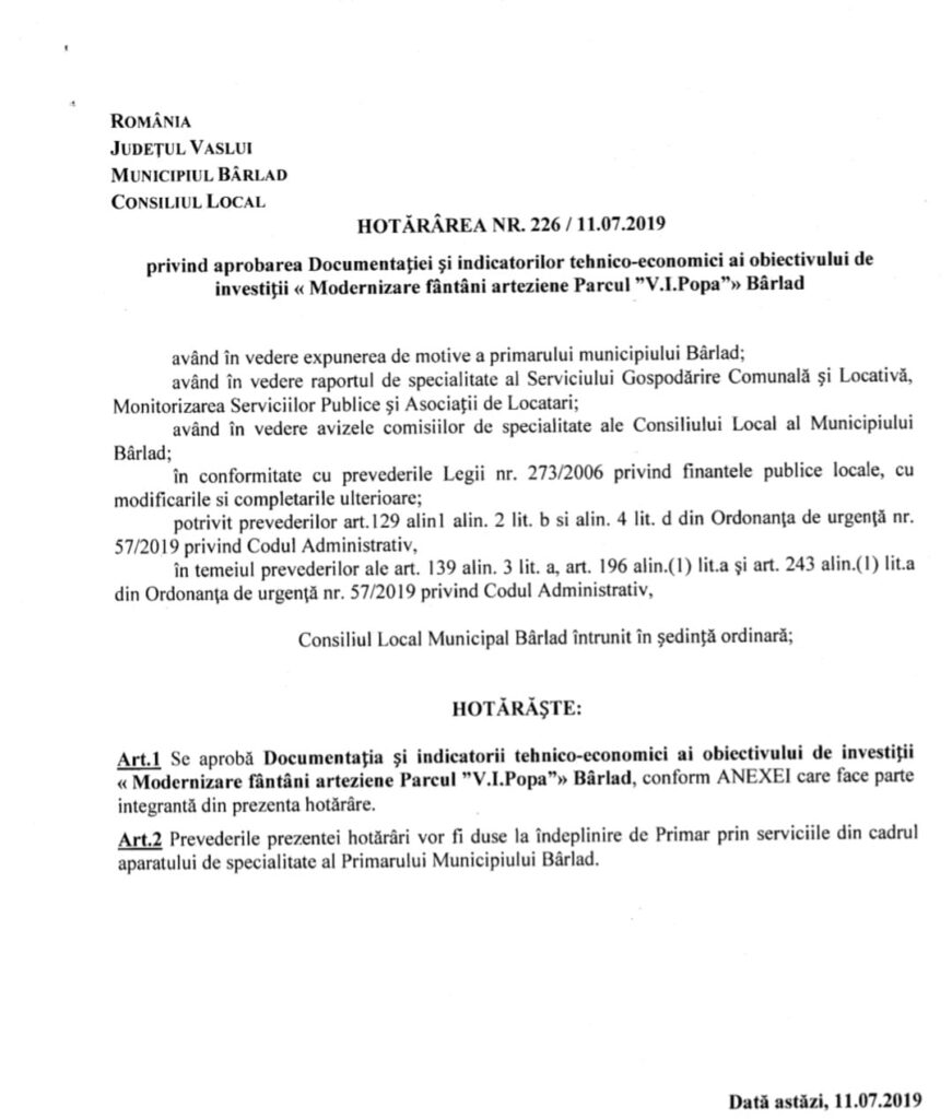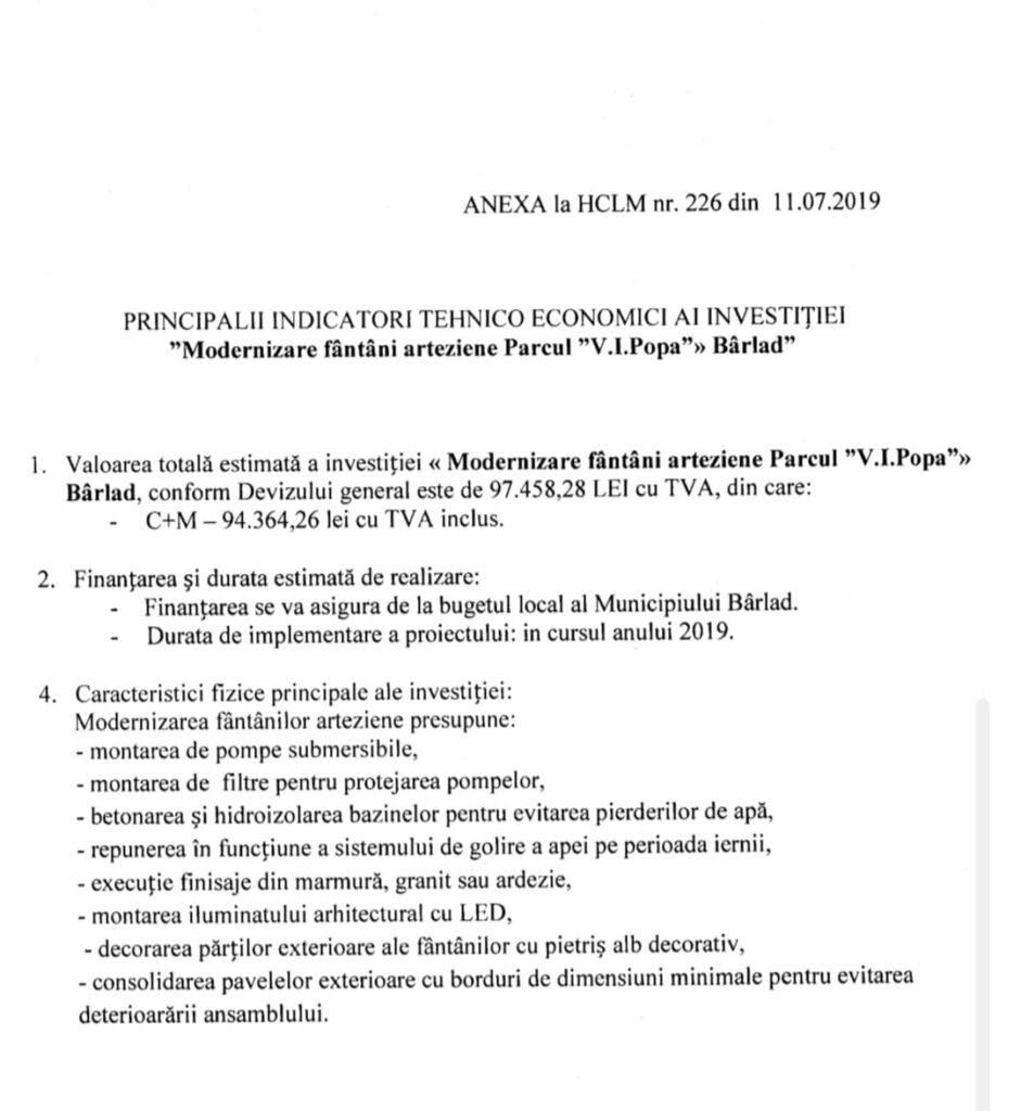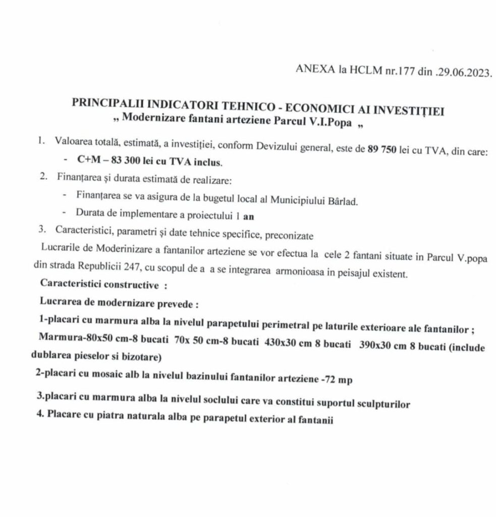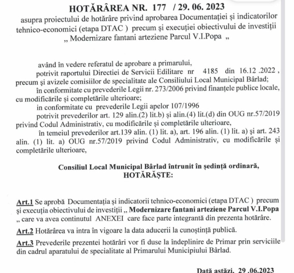 Presată de timp. Pe 18 iunie, Primăria Bârlad a emis o nouă autorizație de construcție pentru modernizarea fântânilor arteziene din parcul Teatrului „Victor Ion Popa”. Nu din respect față de sculpturile realizate de maestrul Marcel Guguianu, ci din cauza presiunii termenului limită impus de Direcția Județeană pentru Cultură (DJC) Vaslui – 30 august 2025, data până la care municipalitatea trebuie să remedieze greșelile din trecut. Este al treilea și ultimul termen acordat.