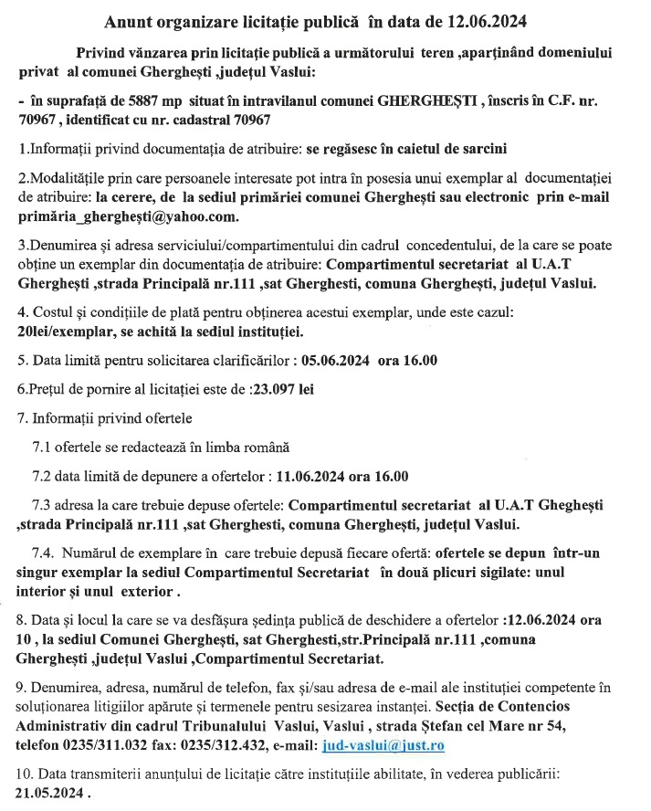 Licitație publică pentru vânzarea unui teren aparținând domeniului privat al comunei Gherghești