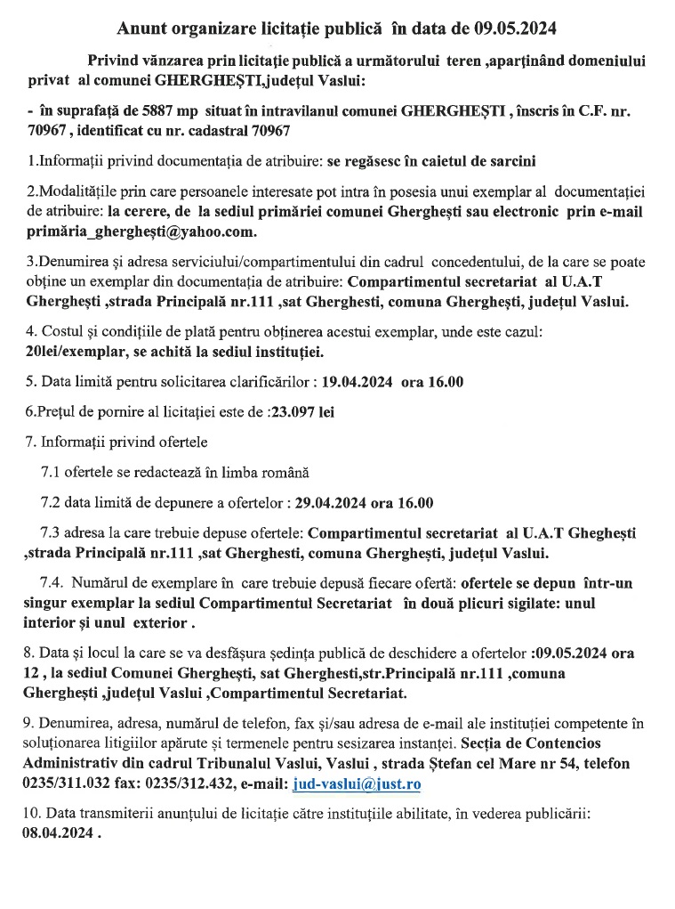 Licitație publică pentru vânzarea unui teren în comuna Gherghești