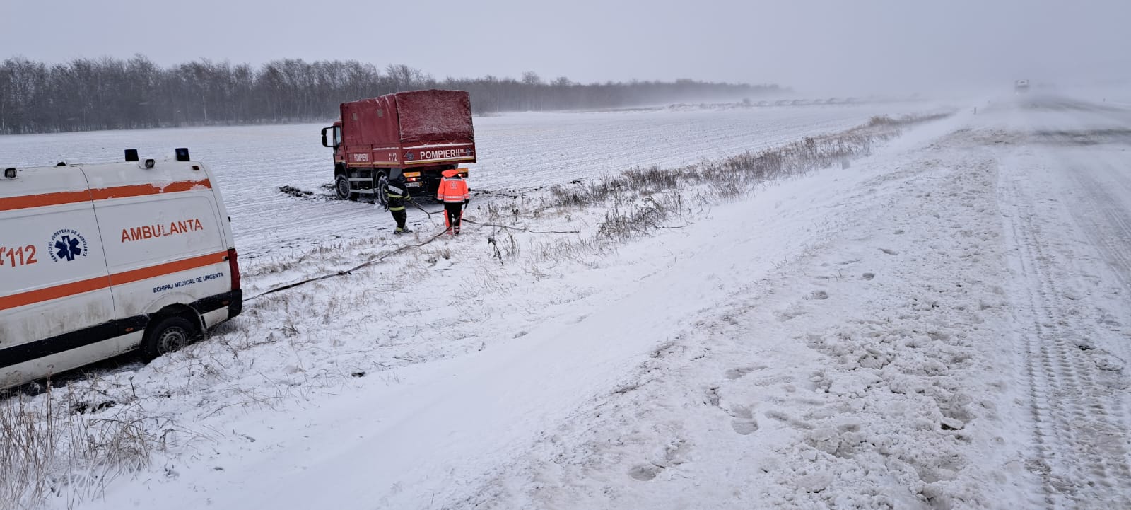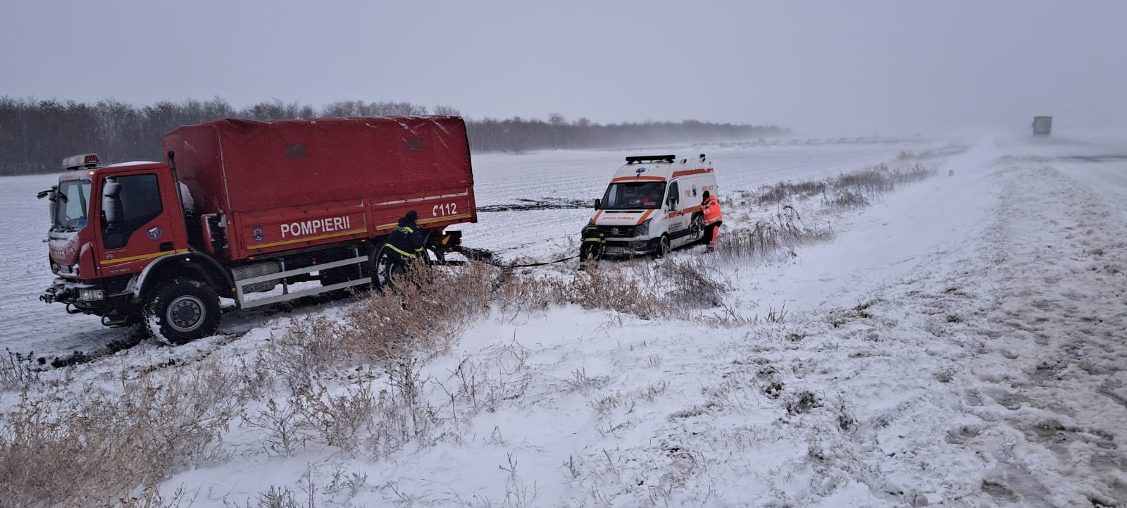 Vremea rea dă de furcă echipajelor SAJ și ISU. Detașamentul de pompieri Bârlad a intervenit cu două autospeciale și echipaje specializate, pentru deblocarea din zăpadă a unei ambulanțe tip B (ambulanță aparținând SAJ Vaslui, substația Bârlad), în dreptul localității Trestiana, comuna Grivița.