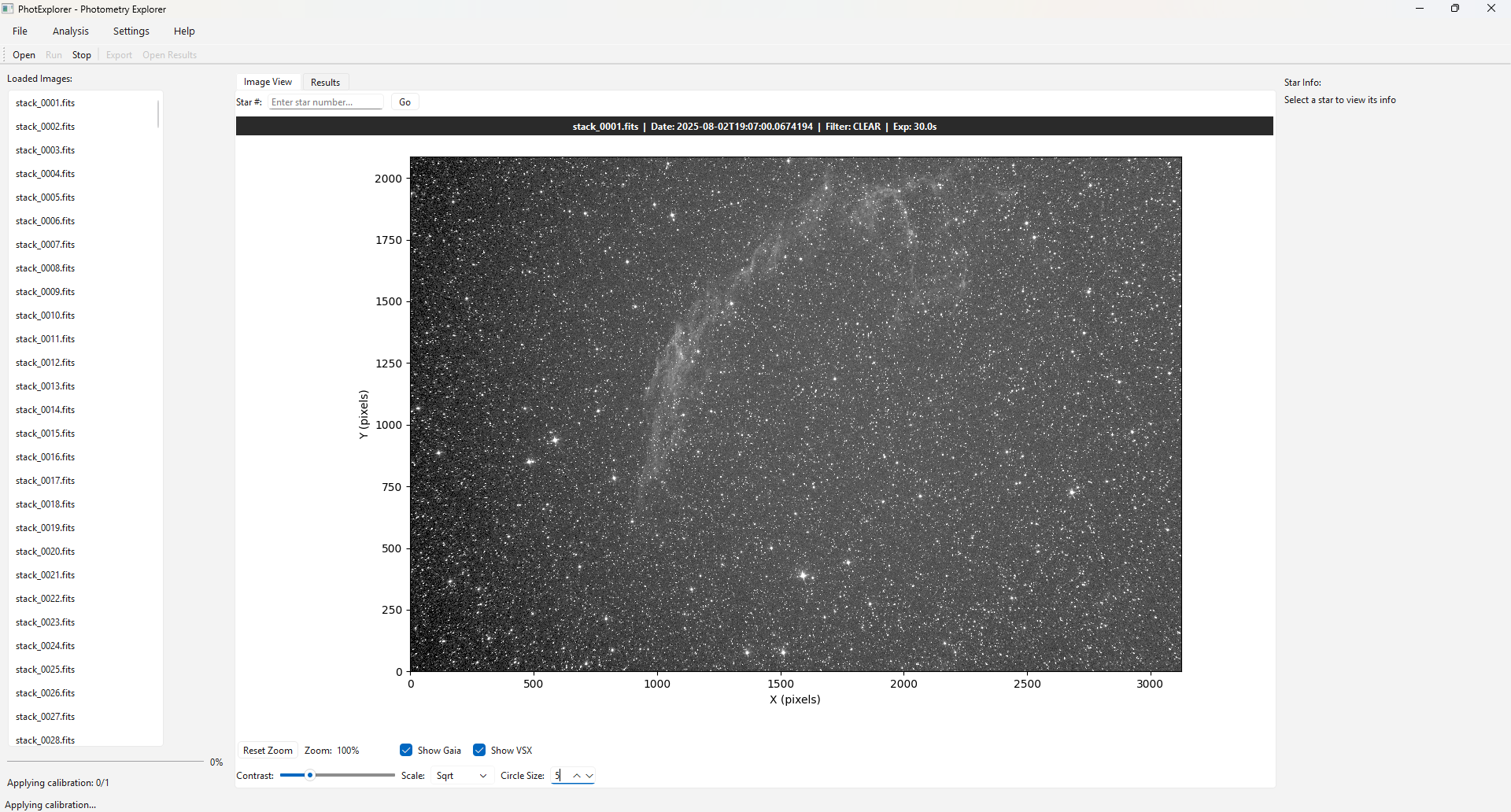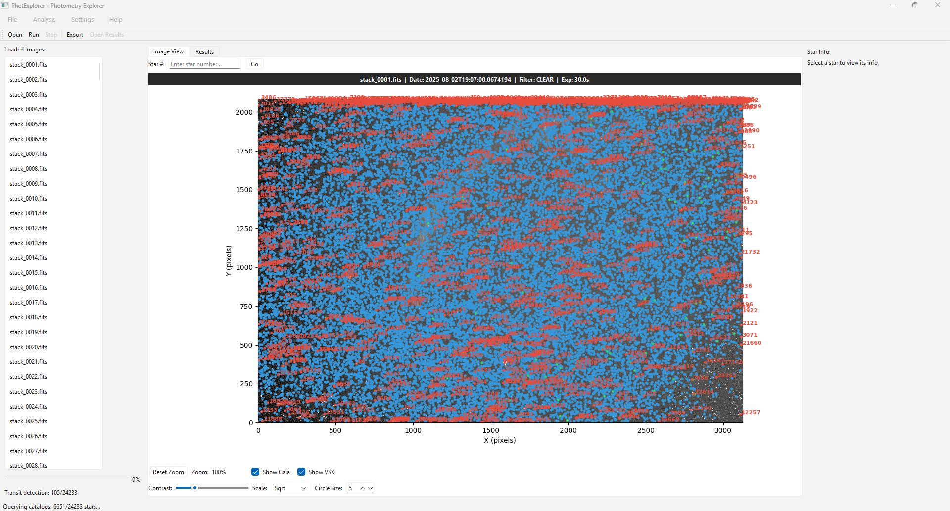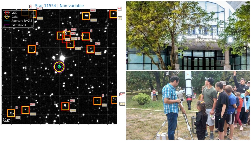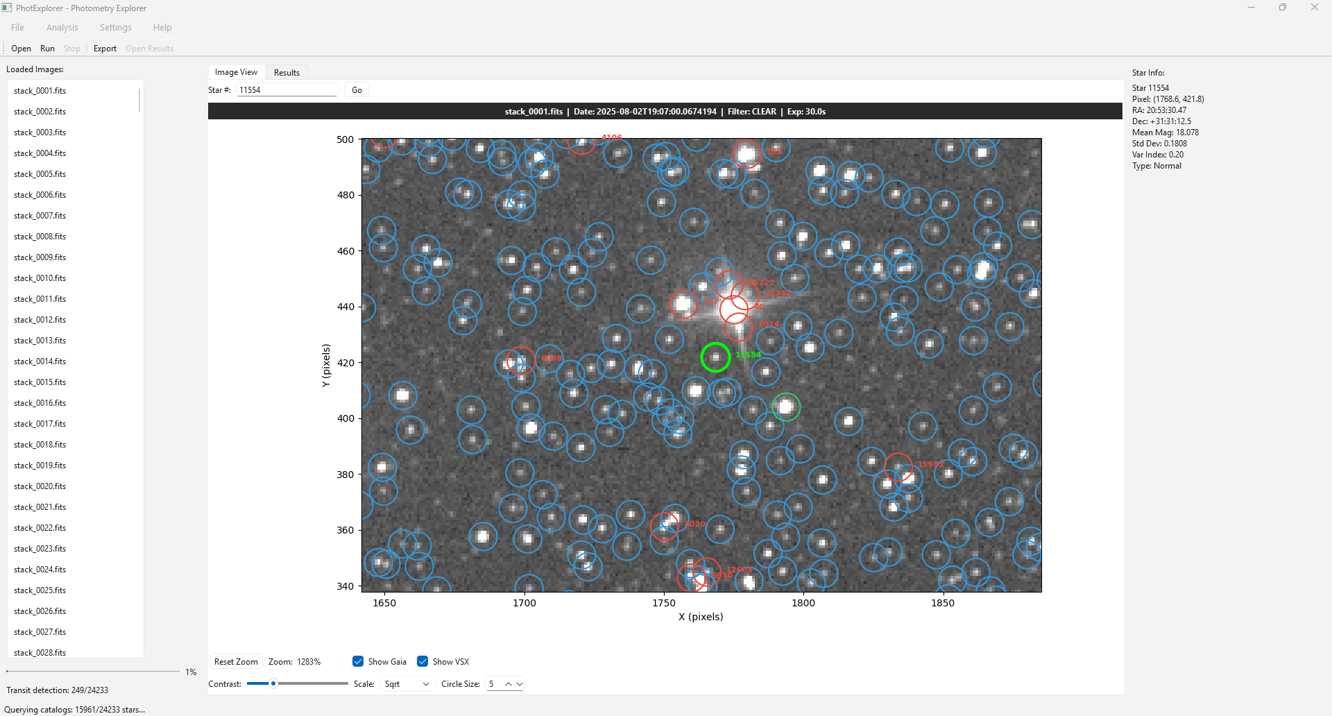 Programul permite analiza fotometrică a unui număr foarte mare de stele din câmpul de observații, generând până la 25.000 de grafice ale curbelor de lumină. În una dintre imaginile analizate, ce surprinde regiunea vestică a nebuloasei Voalul (NGC 6992), Bârlad V72 apare cu numărul de detecție 11554, fiind evidențiată printr-un cerc verde.