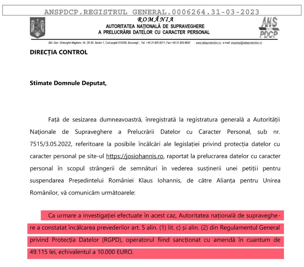 „În noiembrie 2021, am trimis o adresă către Autoritatea Naționala de Supraveghere a Prelucrării Datelor cu Caracter Personal în legătură cu campania lor de a-l suspenda și demite pe Klaus Iohannis, președintele României.