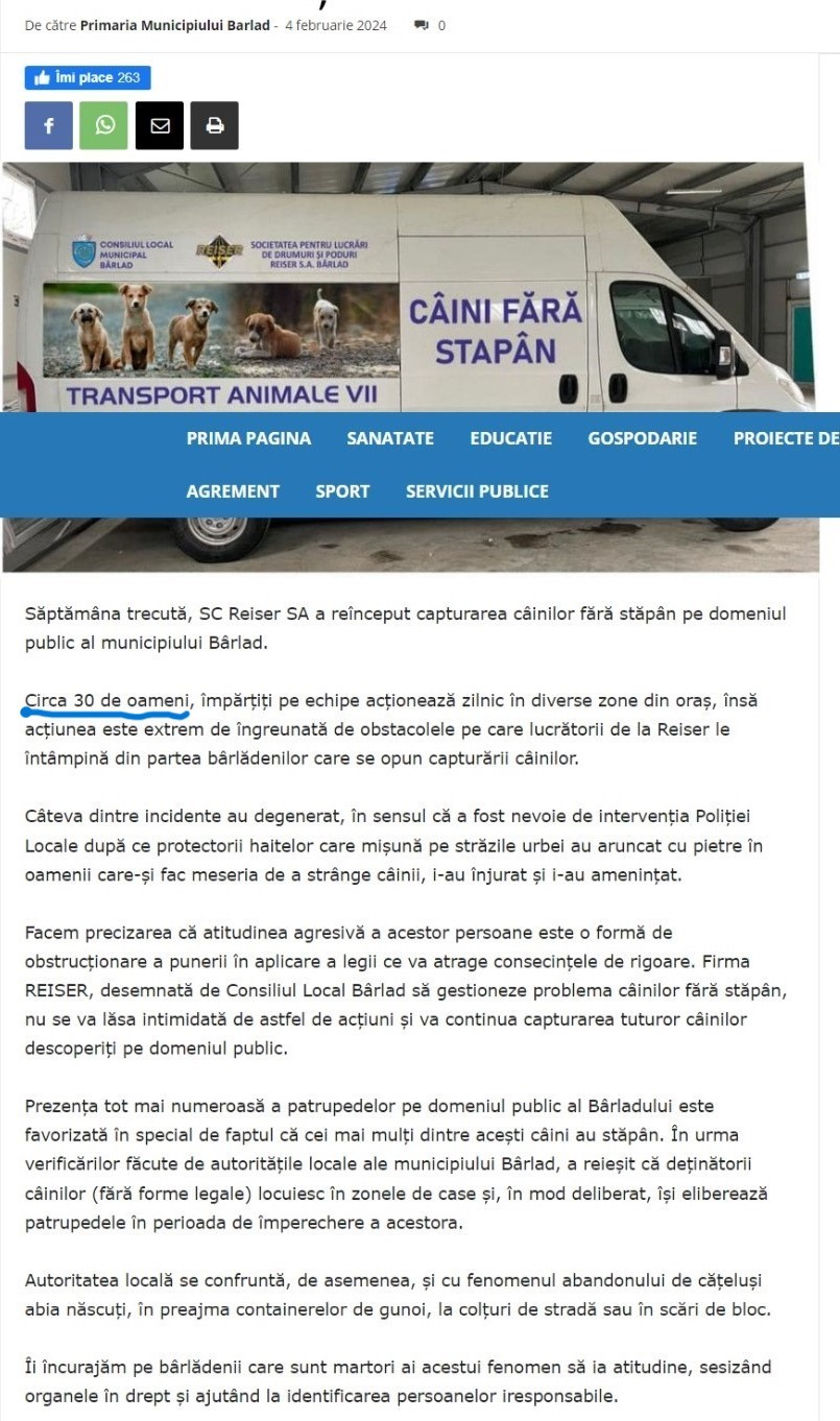Interesant este că în organigrama societății figurează doar doi muncitori care se ocupă cu prinderea câinilor. Cetățenii spun însă că au văzut în oraș două echipe a câte doi muncitori și două mașini, respectiv duba inscripționată, care apare în articolul Primăriei, și o camionetă neautorizată pentru capturarea câinilor, surprinsă în imagini de către un bârlădean.