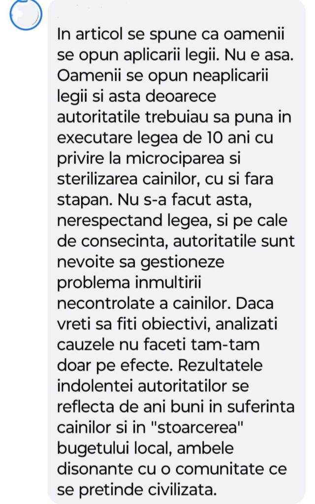 Organizarea de către ONG-uri a unor campanii de sterilizare gratuită este binevenită, dar, în paralel, municipalitatea trebuia să mobilizeze Poliția Locală, care să meargă în cartierele de case pentru a informa proprietarii asupra obligației de a-și steriliza și microcipa câinii.