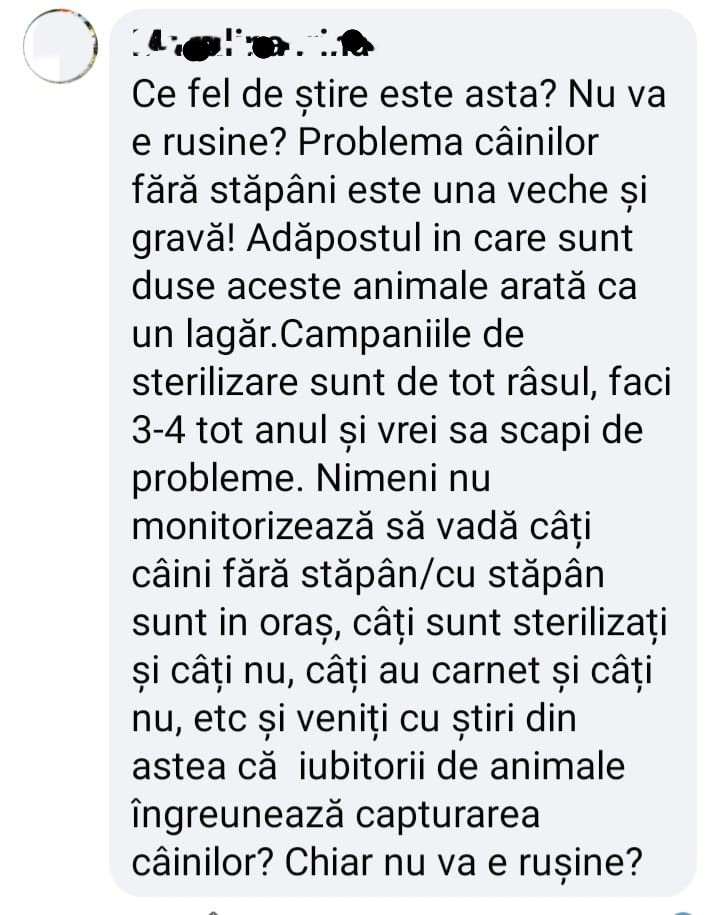 Iar iubitorii de câini nu sunt interesați nici de animale măcar ,pentru că de sterilizat nu își sterilizează câinii,de adoptat nu îi adopta pentru că preferă să cumpere cu sute de euro pui de câini de rasă ,dar când se înmulțesc și și sunt un pericol ,se trezește iubirea in ei și aruncă cu pietre în aia care încearcă să le rezolve problemele murdare.