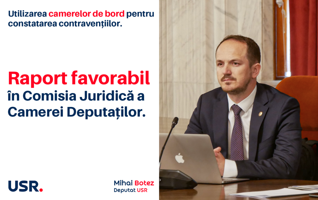 Proiectul inițiat de deputatul USR Mihai Botez prin care Poliția Rutieră va putea sancționa șoferii și pe baza înregistrărilor video provenite de la camerele de bord ale participanților la trafic a primit raport favorabil cu amendamente în Comisia juridică a Camerei Deputaților. Un vot final cât mai rapid pe proiectul de lege, eventual chiar săptămâna viitoare, va salva vieți pe șoselele din România.