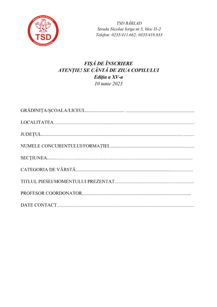 Organizatorii concursului, membrii TSD Bârlad, roagă concurenții să transmită la înscriere și negativul piesei pe care vor evolua. Iată modelul fișei de înscriere: