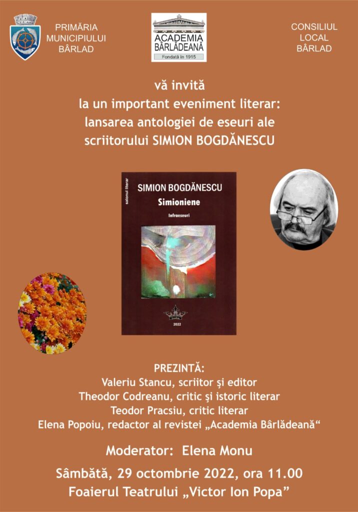 Eveniment literar important, sub egida Academiei Bârlădene. Sâmbătă, 29 octombrie, de la ora 11, în foaierul Teatrului „Victor Ion Popa”, va avea loc lansarea antologiei de eseuri ale scriitorului Simion Bogdănescu.
