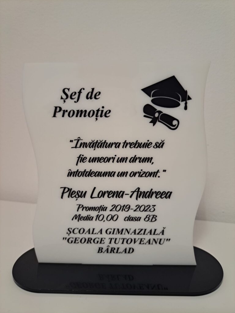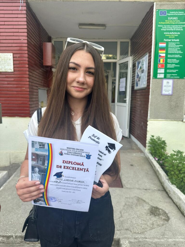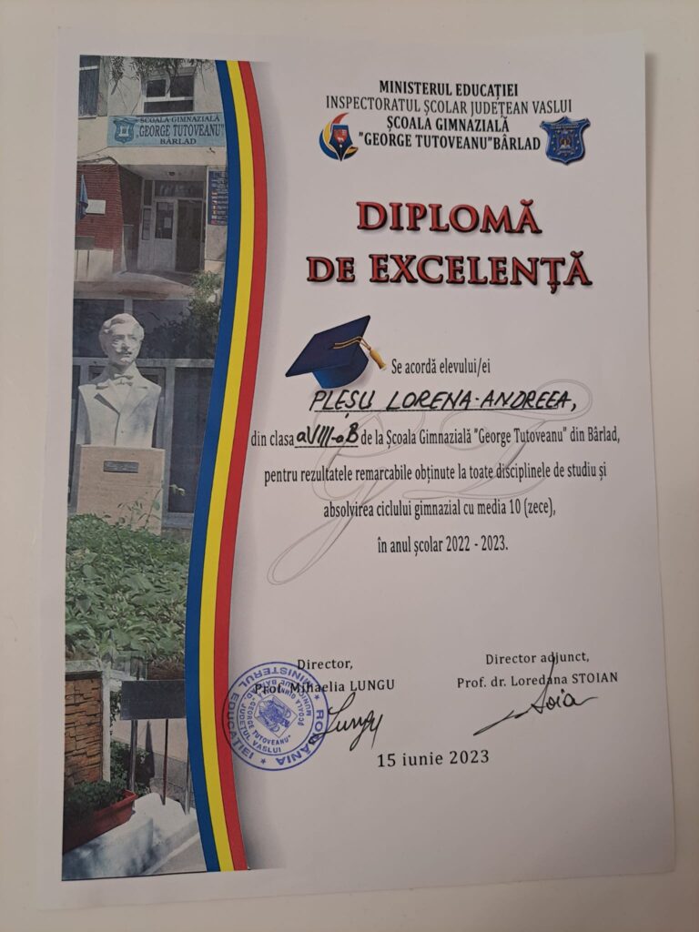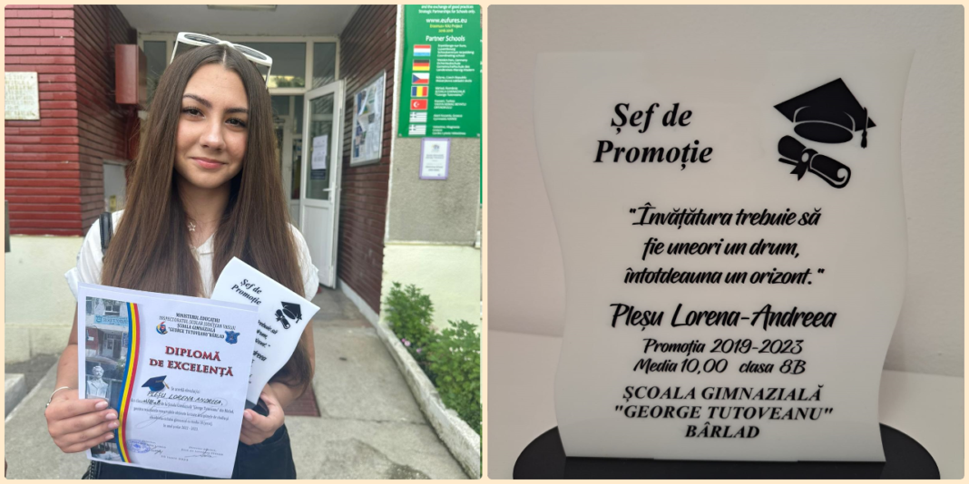 Școala Gimnazială „George Tutoveanu” din Bârlad se mândrește cu o șefă de promoție care a finalizat clasa a VIII-a dar și toți cei patru ani de gimnaziu cu media 10. Lorena Andreea Pleșu, din clasa a VIII-a B (diriginte prof. Cristina Căruțașu), și-a îndeplinit dorința pe care și-a pus-o în gând acum patru ani.