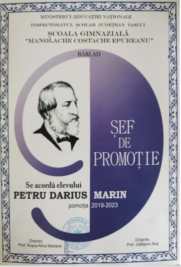 1. Bravoooo, Darius! Un elev harnic, serios, perseverent si constiincios. Fiecare ora, din programul scolar, era pentru Darius un nou inceput in a-i descoperi tainele cunoasterii, dobandirea de noi concepte, priceperi si deprinderi. Suntem mandri ca esti elevul scolii noastre! Felicitam, in acest context, pe parintii lui Darius pentru implicarea totala in realizarea visurilor lui! Felicitam si pe profesorii acestui elev- reper si punct de referinta pentru toti elevii din aceasta scoala, pentru daruire si profesionalism! Mult succes in parcursul educational pe care ti l-ai proiectat si Dumnezeu sa te ocroteasca!