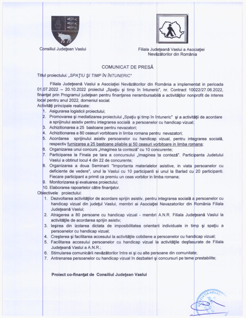 Filiala Judeţeană Vaslui a Asociaţiei Nevăzătorilor din România a implementat in perioada 01.07.2022 – 20.10.2022 proiectul „Spaţiu şi timp în întuneric”, nr. Contract 10022/27.06.2022, finanţat prin Programul judeţean pentru finanţarea nerambursabilă a activităţilor nonprofit de interes local pentru anul 2022, domeniul social.