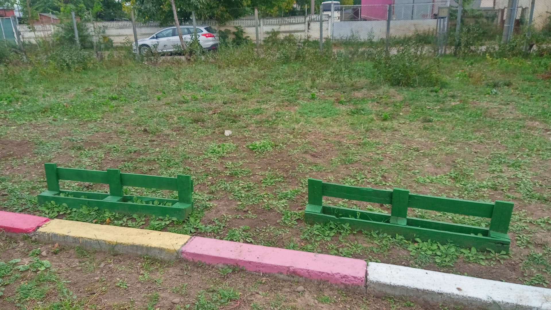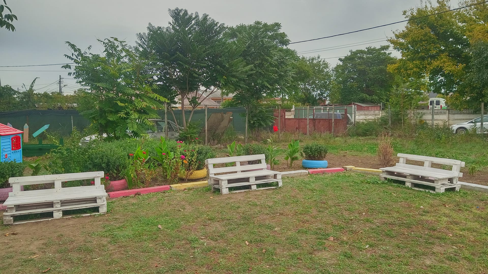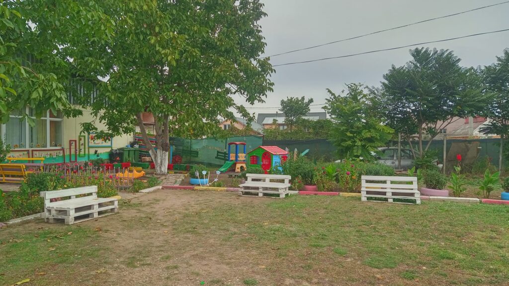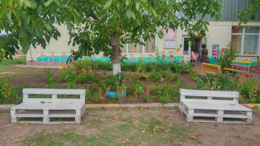 Cu paleții primiți, doi părinți au construit câteva băncuțe cochete, care au fost vopsite în alb. Cu restul materialului s-au realizat suporturi pentru flori, care au fost vopsite în verde. Și vopseaua a fost procurată tot prin sponsorizare de la un depozit de materiale de construcții din apropierea grădiniței.