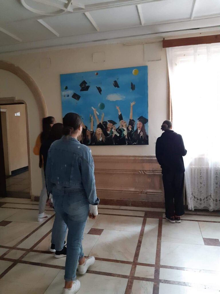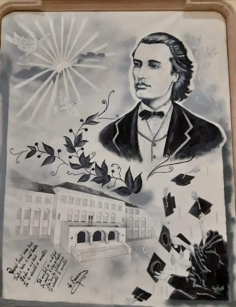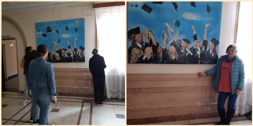 Nu este prima surpriză de acest gen, pe care talentata laborantă o face liceului în care lucrează din 2001, la început ca secretară, iar din 2010 ca laborantă. La etajul I, de exemplu, este expusă o pictură reprezentând clădirea liceului, iar la etajul al doilea, un alt tablou care îl înfățișează pe Mihai Eminescu, patronul spiritual al liceului.