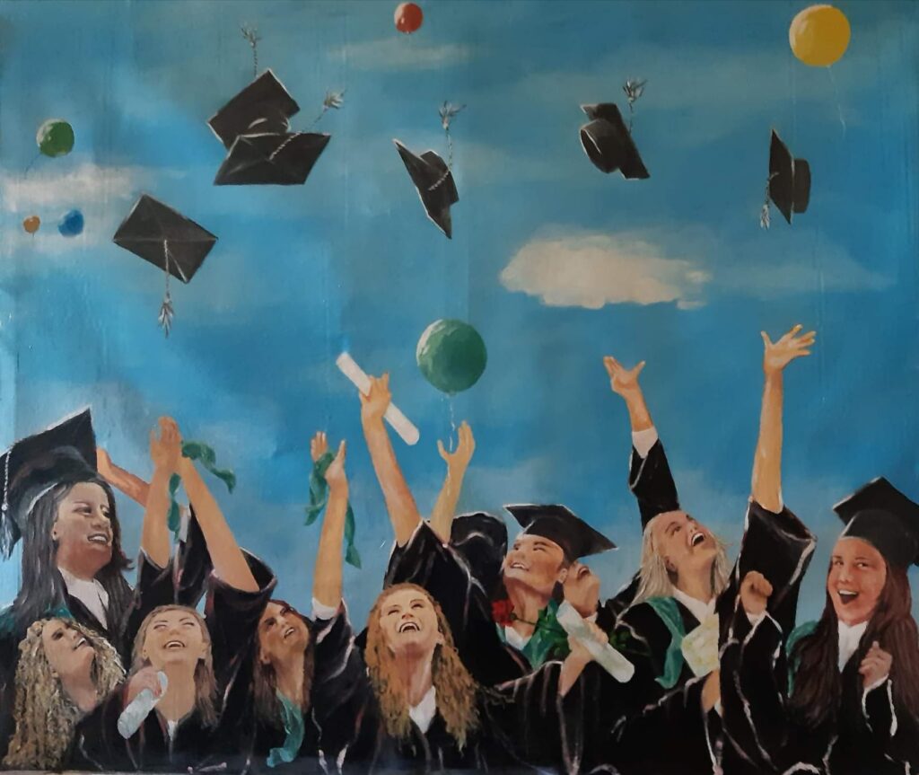 Tabloul cu dimensiunea 170 x 140 cm a fost pictat de Aurica Beciu, laboranta liceului, pentru care pictura este un hobby. Aceasta a imortalizat momentul cel mai emoționant al absolvenților de clasa a XII-a, acela în care tinerii își aruncă tocile.