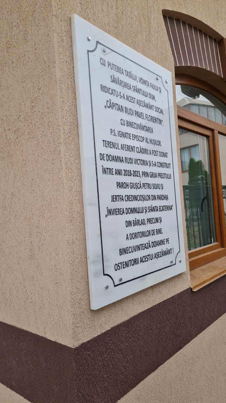 Așezământul social „Căpitan Rudi Pavel Florentin” este tot mai aproape de ziua în care va fi sfințit și inaugurat, la Bârlad. În urmă cu câteva săptămâni a fost montată placa de la intrarea în acest așezământ ce va funcționa ca centru de zi pentru copiii defavorizați, iar săptămâna trecută, a fost montată și pisania. Până la sfârșitul lunii va fi amplasată la intrarea în așezământ și o troiță, creație a sculptorului hușean Ticu Ungureanu.