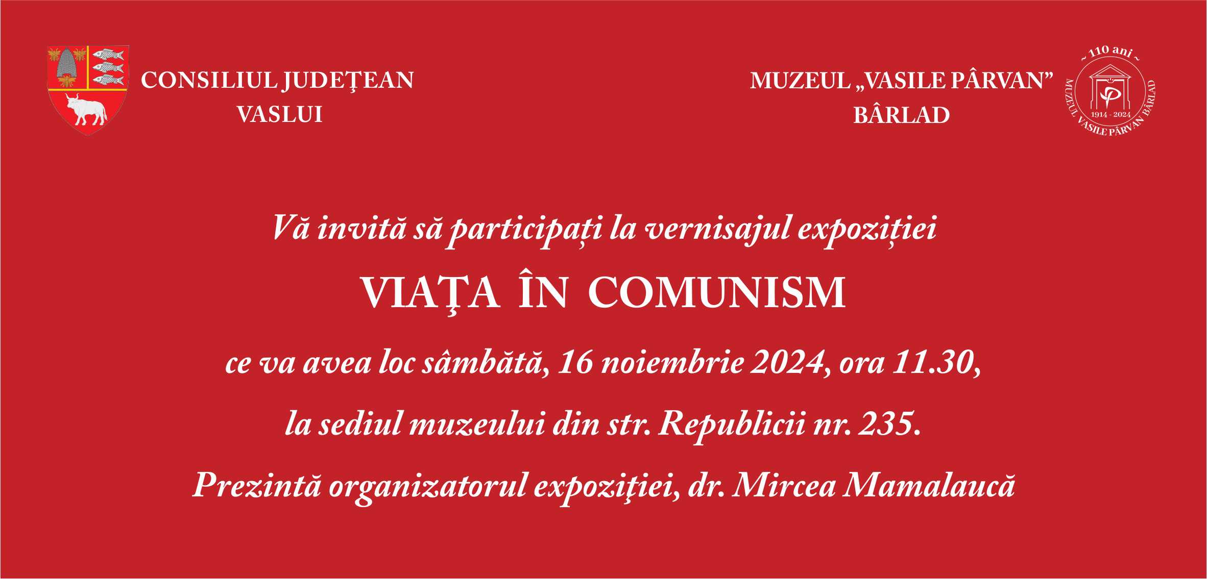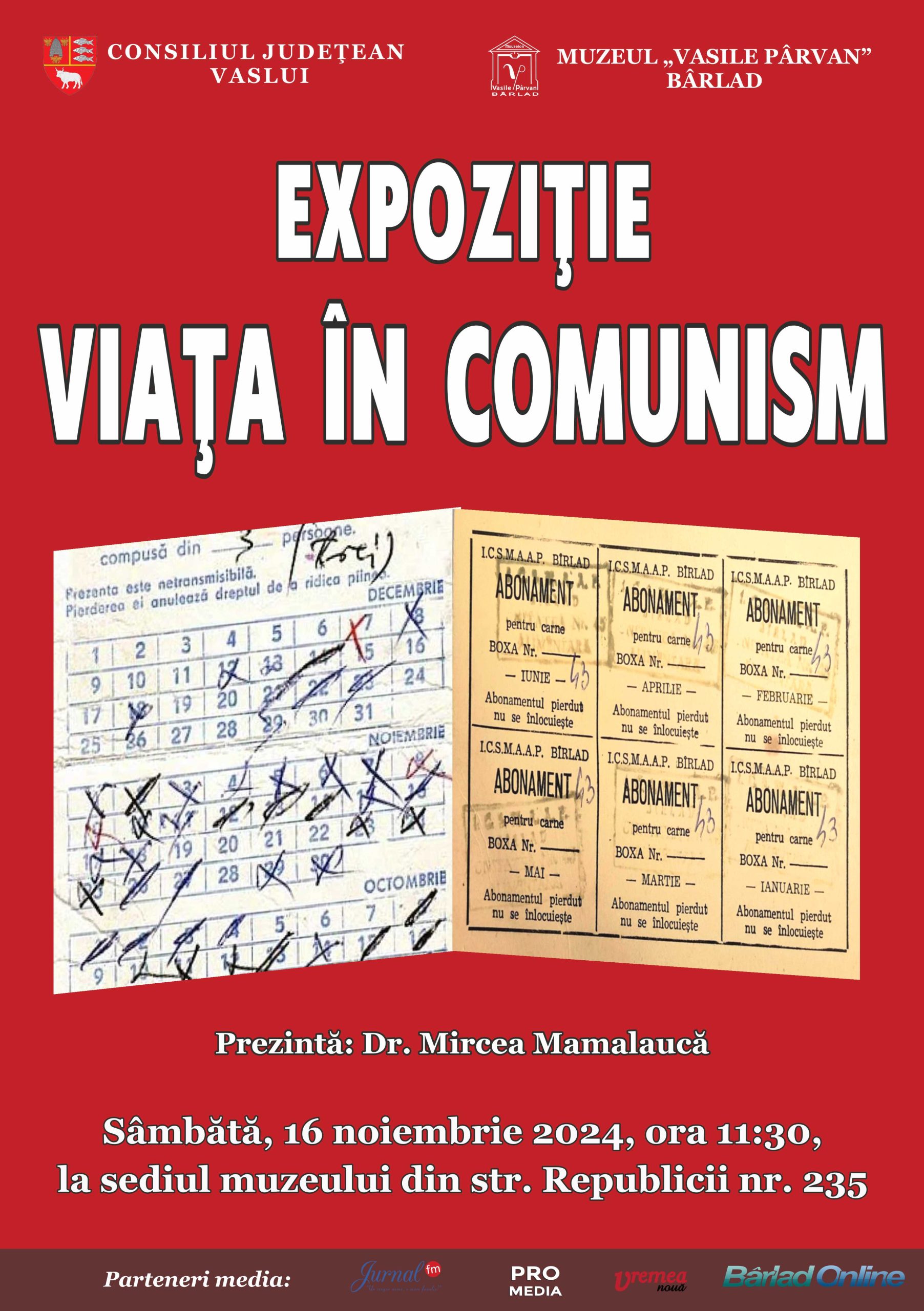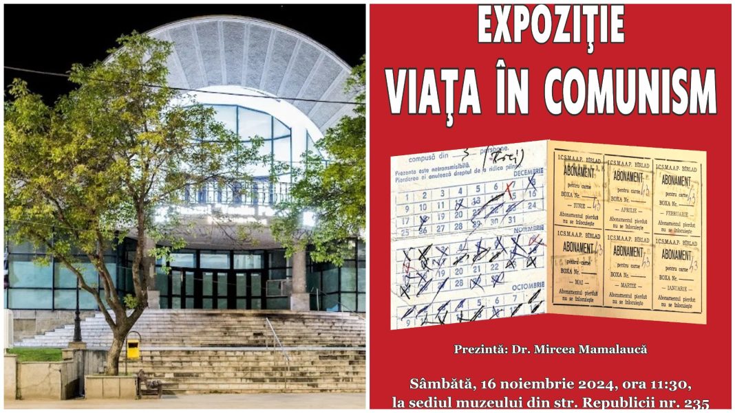 Muzeul „Vasile Pârvan” din Bârlad va găzdui, pe 16 noiembrie 2024, ora 11:30, vernisajul expoziției permanente „Viața în comunism”, un proiect dedicat reconstituirii atmosferei din perioada regimului comunist, prin obiecte și povești din viața cotidiană a românilor. Expoziția, organizată de Mircea Mamalaucă, directorul instituției, va fi deschisă publicului la sediul muzeului din str. Republicii, nr. 235, iar accesul va fi gratuit.