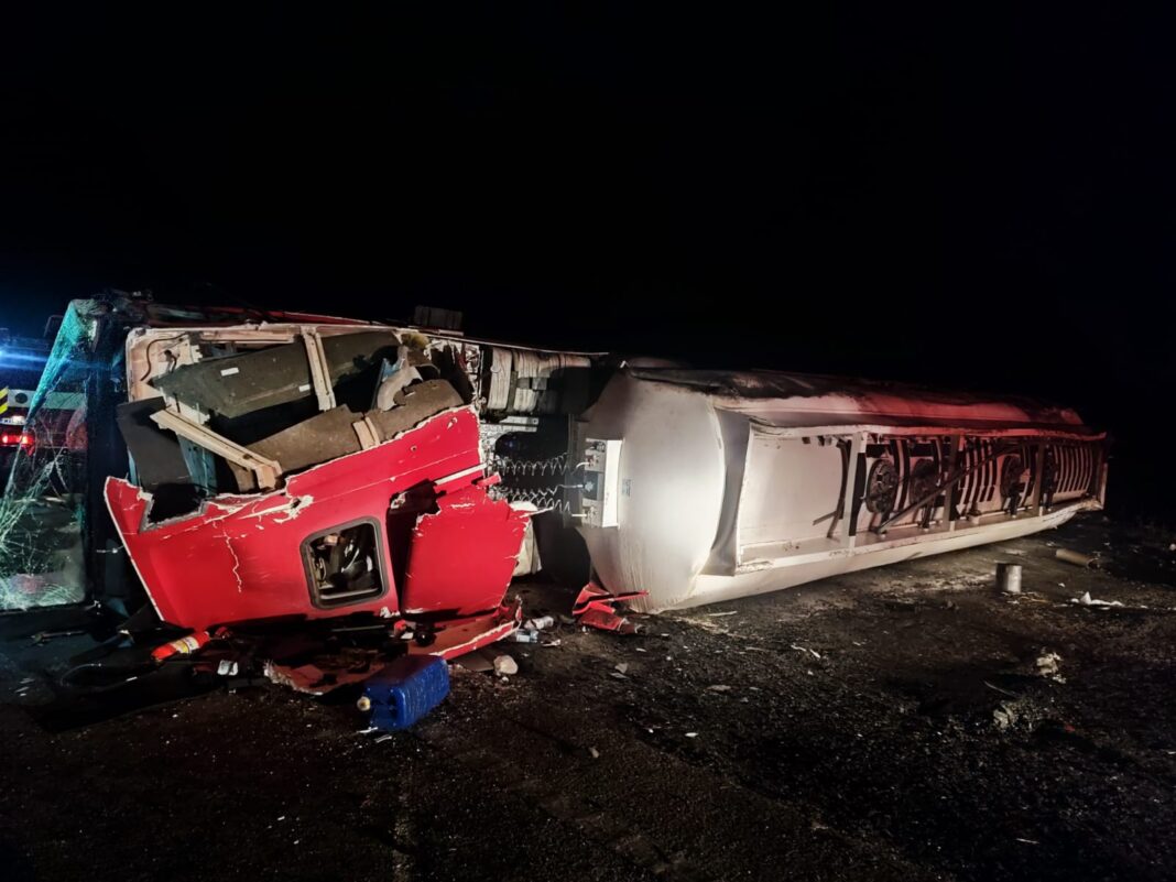În accident a fost implicată o autocisternă încărcată cu 26 tone motorină. În autovehicul se afla doar conducătorul auto. Autocisterna (înmatriculată în Republica Moldova) era răsturnată pe o parte, în afara carosabilului și nu prezenta fisuri, însă existau scurgeri de combustibil pe la capacul de alimentare al primului compartiment.
