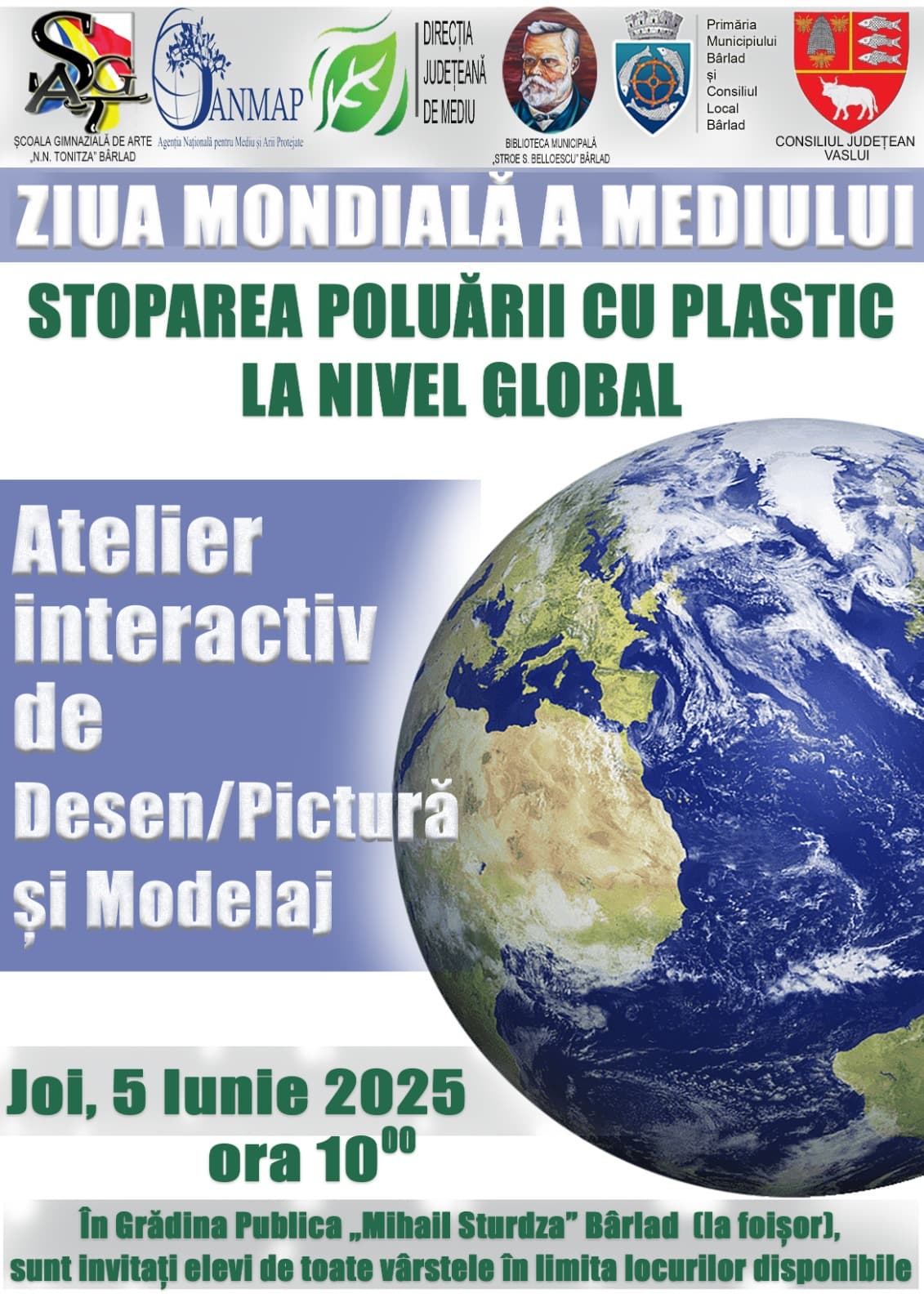 Direcția Județeană de Mediu Vaslui, împreună cu Primăria Municipiului Bârlad, Școala de Arte „N.N. Tonitza” și Biblioteca Municipală „Stroe S. Belloescu”, cu sprijinul Consiliului Județean Vaslui, organizează un atelier creativ destinat copiilor și adolescenților cu vârste între 7 și 18 ani.